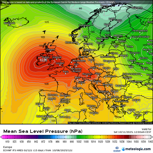 Een krachtig hogedrukgebied bij de Britse Eilanden blokkeert de westcirculatie en geeft later in de week wind uit een noordelijke richting. Bron: Meteologix.com