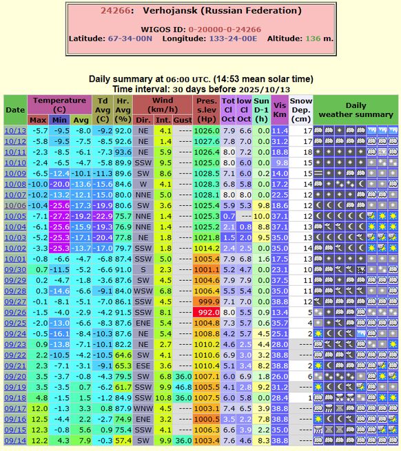 Afgelopen september werd al enkele keer een minimale temperatuur van beneden de -10°C gemeten op het weerstation van Verchojansk, waarbij het overdag rond de 0 graden werd. Een week eerder was het er nog 12 graden. Sinds het einde van september ligt er een sneeuwdek van meer dan 10 centimeter door een voorbijgaand depressiesysteem. De reflecterende witte sneeuw heeft waarschijnlijk bijgedragen aan het sterk dalen van de temperatuur.
