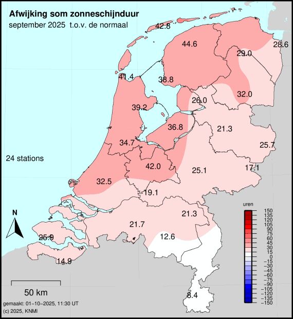 In het hele land scheen de zon in september meer dan gebruikelijk. In het noordwesten was dit wel een stuk meer dan in het zuidoosten. Bron: KNMI