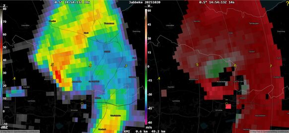Radarbeelden van de bui bij Assenede toont een supercell met een duidelijke 'haak'. Links is een beeld van de regenintensiteit, rechts de snelheid (beweging) van de cell. Bron: weerwoord.be