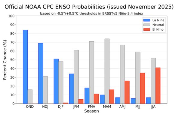 In de periode van december tot maart 2026 is de kans op La Niña niet veel hoger dan de kans op ENSO-neutraal (51% ten opzichte van 48%). Na de winter ligt de kans op ENSO-neutraal duidelijk het hoogst met 60-70%. Vanaf de zomermaanden lijkt weer een El Niño op te kunnen duiken; dan voor het eerst sinds twee jaar.