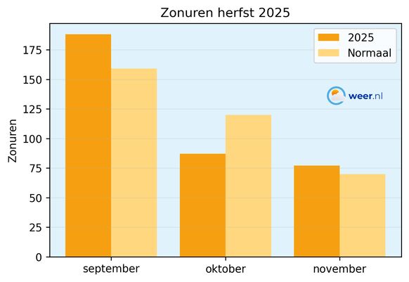 In september begon de herfst erg zonnig. Gemiddeld over het land bekeken verliep september maar tien keer eerder zonniger. Hiermee werd de zonnige zomer van 2025 doorgetrokken. Uiteindelijk kwam de herfst uit op een vrij normale waarde van 352 zonuren. Dit kwam met name omdat oktober een stuk somberder verliep dan normaal. Toch werd er dit jaar de mijlpaal behaald van meer dan 2000 zonuren in Nederland. Dit is pas de vijfde keer sinds 1906 dat de zon meer dan 2000 uur schijnt in een jaar. Meer zonuren past in de trend van afgelopen jaren en wordt verklaard doordat er minder luchtvervuiling aanwezig is
