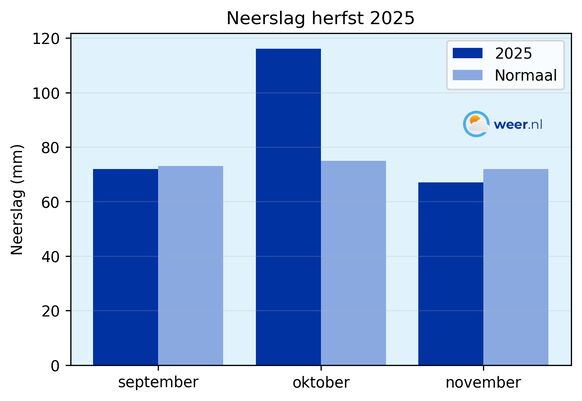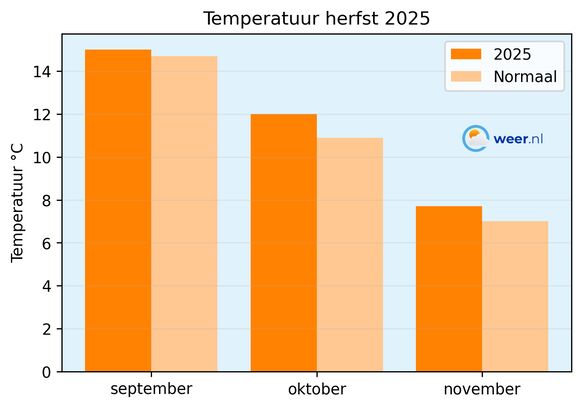 Verder kwam het deze herfst tot twee zomerse dagen (warmer dan 25 graden), 13 warme dagen (warmer dan 20 graden) en 8 vorstdagen.