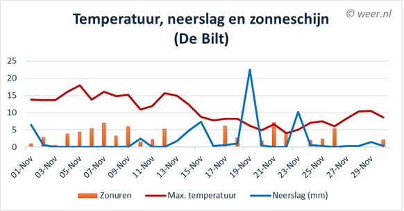 Het einde van de herfstperiode nadert. November vormt doorgaans de overgangsmaand van zacht (nazomer)weer naar een meer winters tafereel. Deze maand vond er een soortgelijke wisseling plaats: recordzachte, zonnige dagen maakten plaats voor kou en regen. Als geheel was november aan de zachte en zonnige kant.Warme eerste helft