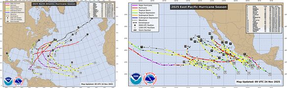 De tropische stormen en orkanen in het Atlantische gebied (links) en de oostelijke Stille Oceaan (rechts) gedurende het orkaanseizoen van 2025. Bron: NHC / NOAA