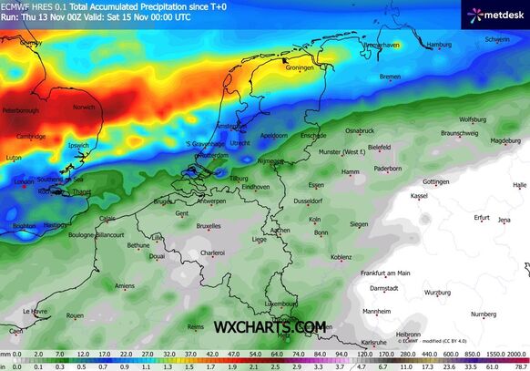 De neerslagsom van vrijdag 14 november volgens het Europese weermodel. De buien laten het zuidoosten vrijwel ongemoeid, maar het noordwesten kan een natte dag verwachten. Bron: WXCharts