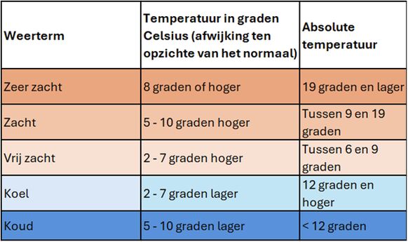 Ligt de temperatuur boven het gemiddelde, dan is het weer zacht of warm, of is het weer mild. Ligt deze onder het gemiddelde, dan is het koud of koel. Maar hoeveel warmer of kouder is dit?