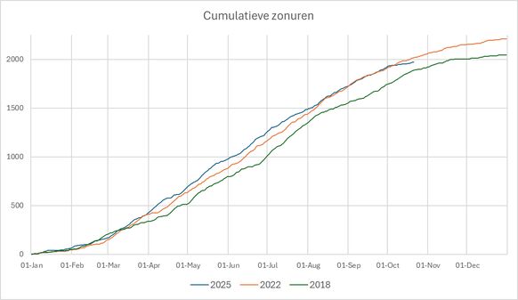 Vanaf augustus was het regelmatig stuivertje wisselen tussen de zonuren van 2025 en 2022. De stijging van dit jaar stagneerde wat, terwijl het in 2022 juist erg zonnig was in augustus. Na het begin van oktober kwam Nederland onder dikke wolkenluchten terecht en daalde het aantal zonuren tot onder het langjarig gemiddelde. Op dat moment stak de som van 2022 weer er bovenuit.