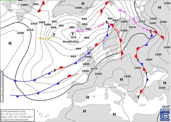 Situatie dinsdag 4 november om 12:00: Lagedrukgebieden ten noordwesten van ons, hogedruk ten zuidoosten. Bron: wetterzentrale.de.