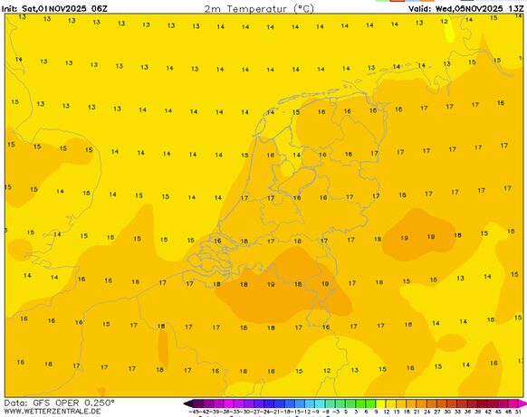 Voorspelling temperatuur woensdag 5 november in Nederland om 13:00 uur door het GFS-model. Bron: Wetterzentrale.de.