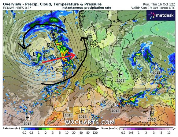 Hogedruk verlaat onze regio en maakt de ruimte vrij voor lagedrukgebieden. Vanaf zondagavond trekken regelmatig regenbuien over het land. Bron: WXCharts / ECMWF
