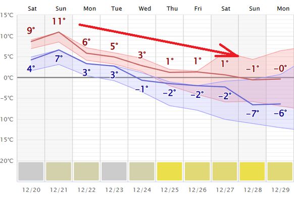 Een strakke temperatuurdaling zet in vanaf de eerste week van de Kerstvakantie. Bron: Meteologix