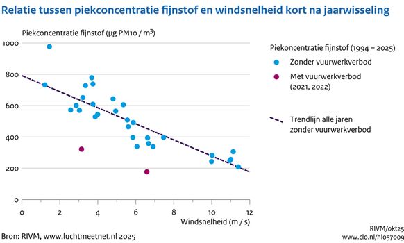 Dit figuur laat de relatie tussen de concentratie fijnstof en windsnelheid zien, bij meer wind is de concentratie doorgaans lager.