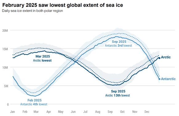 Het zee-ijs in zowel het Arctische als het Antarctische gebied lag het hele jaar beneden de gemiddelde omvang. Bron: Copernicus Climate Change Service