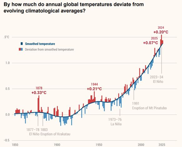 Het cluster van 2023-2025 is duidelijk één van de warmere perioden ten opzichte van de variatie in de gemiddelde temperatuur. Ook de relatief warme periode van 1937-1945 valt op. Op de figuur is te zien dat de opwarming sinds de jaren 70 versnelt.