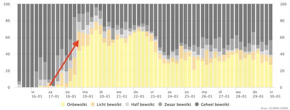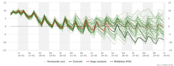 De weerpluim laat vanaf zondag een duidelijke 'zaagtand' zien, wat zonnig, droog weer betekent waarbij het flink kan afkoelen gedurende de nacht. De bijbehorende kans op zonnig weer stijgt vanaf komend weekend flink. Bron: KNMI.