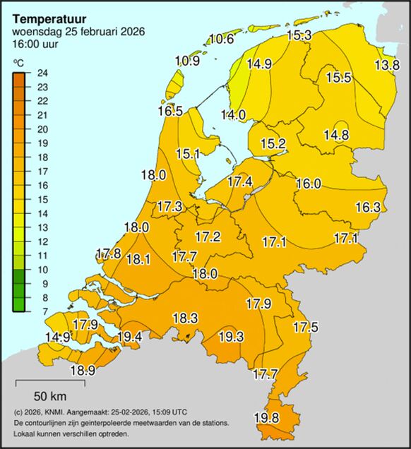 Temperatuur op 25 februari 2026 om 16:00 uur. Toen werd het dagrecord in Maastricht aangetikt. Bron: KNMI