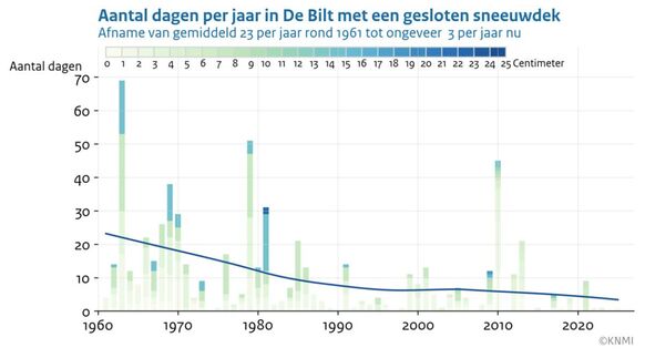 Het aantal dagen per jaar dat er in De Bilt een gesloten sneeuwdek ligt, is sterk afgenomen ten opzichte van de jaren 60. De blauwe lijn laat de trend zien. Bron: KNMI