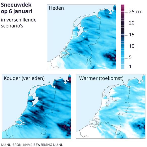Het sneeuwdek van deze week, vergeleken met een vroeger (kouder) en toekomstig (warmer) scenario. Bron: KNMI / NU.nl