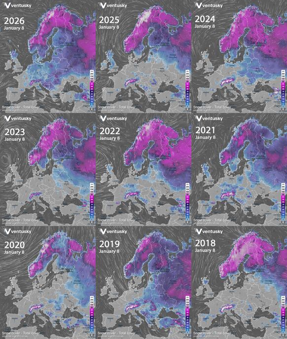 Op 8 januari was bijna 80% van Europa bedekt met sneeuw, het meeste sinds 2017. Bron: Ventusky