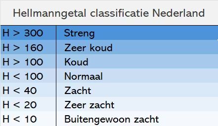 Vervolgens wordt de optelsom geclassificeerd van een strenge tot buitengewoon zachte winter. Een strenge winter met een Hellmanngetal hoger dan 300 is heel zeldzaam en is sinds het begin van de metingen slechts drie keer voorgekomen (in 1942, 1947 en 1963). Een zachte winter heeft een Hellmanngetal lager dan 40; ongeveer de helft van de Nederlandse winters vallen in deze categorie. Buitengewoon zachte winters met een Hellmanngetal van onder de 10 waren onder andere 2022 en 2025.