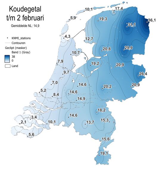 Met de verdeeldheid in temperaturen de afgelopen weken is het geen verrassing dat het koudegetal binnen Nederland aardig wisselt. Tot en met 2 februari behaalde het noordoosten een koudegetal tussen de 30 en 40, maar het zuiden kreeg een schamele 5 punten toegekend. Weerstation Nieuw-Beerta staat aan de top met op dit moment 46,4 punten. In Vlissingen blijft het koudegetal steken op 2,1.