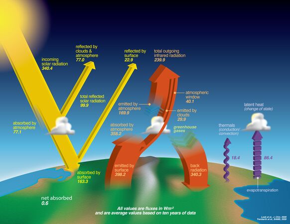 De stralingsbalans van de aarde. De gele pijlen laten zien waar zonnestraling naartoe gaat, de oranje pijlen laten zien waar straling vanaf het aardoppervlak terechtkomt (bron: NASA)