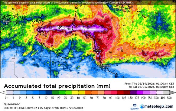 De neerslagsom van donderdag tot en met zaterdag, veroorzaakt door cycloon Narelle. In het noordelijkste puntje van Queensland viel tot wel 500 mm regen. Hierna wordt ook ruim 100-200 mm verwacht in het Noorderijk Territorium. Bron: Meteologix