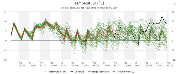 Als de straalstroom weer noordelijker komt te liggen, neemt vanaf begin volgende week de kans toe dat de stroming bij ons vaker westelijk wordt. Lagedrukgebieden vanaf de oceaan kunnen ons dan makkelijker bereiken en maken het weerbeeld wisselvalliger. Daarbij blijven de temperaturen vaak zacht en lijkt winterweer na dit weekend voorlopig langzaam uit de weerkaarten te verdwijnen.