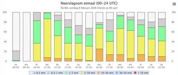 Vanaf dinsdag zijn de neerslagkansen groot. Bron: KNMI.