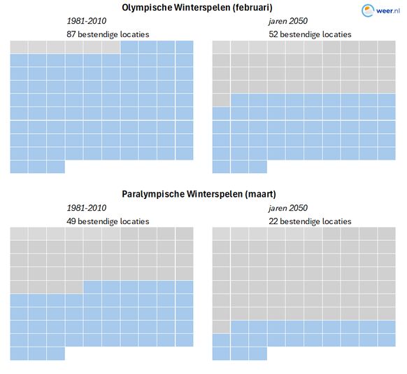 Wat betreft de sneeuw in de tweede helft van deze eeuw is er geen goed nieuws. Onderzoek uit 2024 bekeek de klimaatbestendigheid van 93 locaties voor de Olympische en Paralympische Winterspelen. Onder het SSP2-4.5 scenario zijn er in de jaren 2050 nog maar 52 locaties bestendig voor de Winterspelen. In het referentiekader van de periode 1981-2010 waren er 87 geschikte locaties. In de jaren 2080 daalt dit zelfs verder naar 46, slechts 50%. Het heeft niet alleen gevolgen voor het evenement zelf, maar ook voor de voorbereidingen. Atleten moeten opzoek naar plekken die nog koud genoeg zijn om te trainen, of genoegen nemen met enkel kunstmatige sneeuw en ijs.