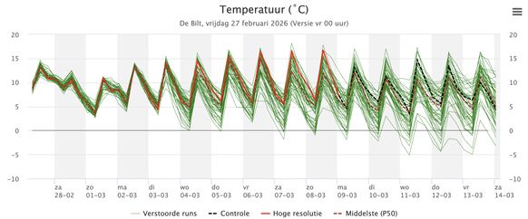 Hoewel de temperatuur dus nog enigszins onzeker is, lijkt lenteweer wel zeker. De weerpluim laat vanaf maandag een duidelijke zaagtand zien. Dit betekent dat er een relatief groot verschil is tussen de temperatuur gedurende de dag en nacht, iets dat typisch is voor onbewolkte dagen. Door de zon kan het dan namelijk snel opwarmen, maar bij gebrek aan wolken gedurende de nacht ook weer snel afkoelen. In de vroege ochtend zal het daarom ook vrij fris zijn, met waarden van circa 5 graden. Door de weinige wind is er hierbij ’s ochtends ook kans op mist, die gedurende de ochtend dan weer oplost.