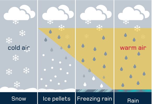 Het effect van de temperatuuropbouw op de neerslagsoort. Vooral de dikte van de warme luchtlaag bepaalt het type neerslag (bron: National Weather Service, NOAA)