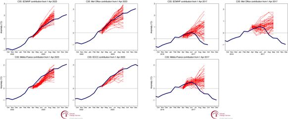 De voorspellingen van april 2023 (links) en april 2017 (rechts). De rode lijnen zijn de voorspellingen van het ensemble en de blauwe lijn is het uiteindelijke verloop van het ENSO-systeem. Bron: ECMWF