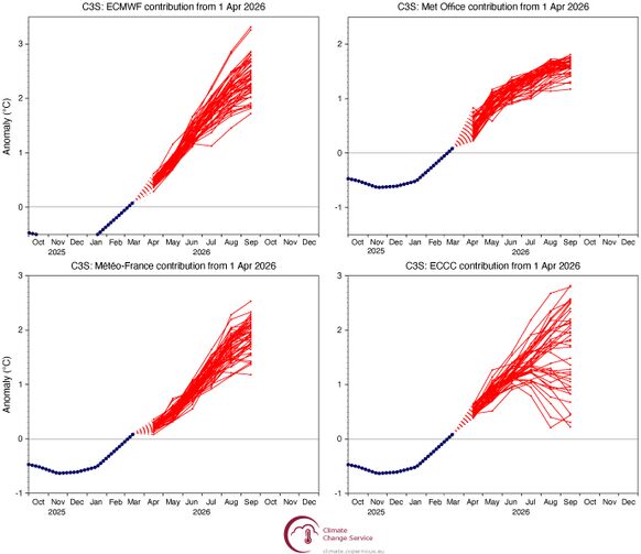 In 2017 was de spreiding binnen het ensemble groter en was warmer zeewater later in het jaar vrij waarschijnlijk, met ook een kleine kans op normale omstandigheden. Inderdaad warmde de regio op in het midden van de zomer, maar koelde het vrij snel af tot een La Niña in de winter. De ontwikkeling hiervan lag buiten het voorspelde bereik. De werkelijkheid kan zich op onverwachte manieren ontwikkelen! Verkeerde ENSO-voorspellingen van deze omvang komen niet vaak voor, maar zijn wel mogelijk. Het sterkere signaal van 2026, dat zich nu over de Stille Oceaan verspreidt, is waarschijnlijk wel lastiger van koers te brengen dan de gebeurtenis in 2017.