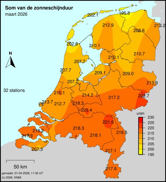 De hoeveelheid zonneschijn in het hele land in maart 2026. Het zuiden pakte de meeste zonneschijn met 220 uur, terwijl het noordelijk kustgebied er het slechtst vanaf kwam met 195 uur. Nog steeds is dat veel meer dan het langjarig gemiddelde (ongeveer 140 uur) (bron: KNMI).