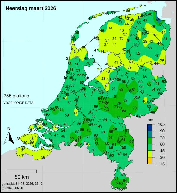 Al met al verliep maart 2026 zacht, met een gemiddelde temperatuur van 8,1 ℃ tegenover 6,5 ℃ in het langjarig gemiddelde*. Daarbij was het iets droger dan normaal met gemiddeld over het land 47 millimeter neerslag, tegenover 53 millimeter in het langjarig gemiddelde. De neerslag was ook vrij gelijk verdeeld over het hele land.