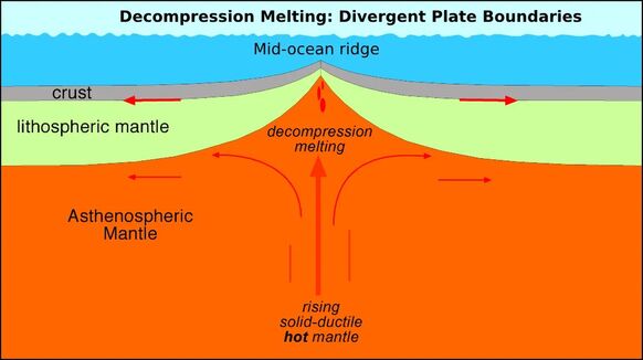 Onder de mid-oceanische rug is de aardkorst een stuk dunner, waardoor daar de druk op het magma kleiner is en het mantelgesteente sneller smelt. Dit is hetzelfde mechanisme achter het smelten van mantelgesteente door het smelten van landijs (bron: geologyin.com).