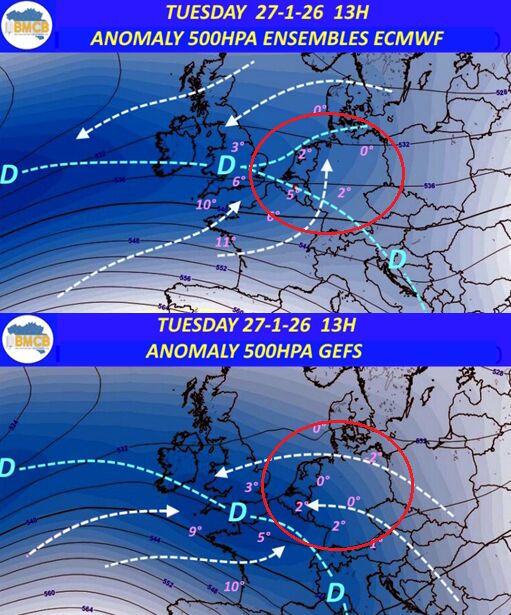 Vanaf vrijdag trekt de koude lucht ook uit het noorden en komen de temperaturen dichter naar elkaar toe. Dit is wel onderhevig aan veranderingen in modelberekeningen. Er hoeven maar kleine veranderingen te gebeuren en de grens van koude lucht schuift op. Dit maakte de verwachtingen voor deze periode bijzonder moeilijk, met modellen die continu sprongen tussen een koude en een milde uitkomst. Had de wintergrens zuidelijker gelegen, dan was Nederland terechtgekomen in een poel van koude lucht en kon zich een strengere winterperiode voordoen. Dit stond aanvankelijk op het programma, maar hield geen stand. Het lagedruksysteem bij het Verenigd Koninkrijk hangt te ver noordelijk, waardoor zachtere lucht uit het zuidwesten meer ruimte krijgt en de koudere oostelijke stroming alleen het noordoosten aandoet. De komende dagen wordt dit opnieuw spannend.