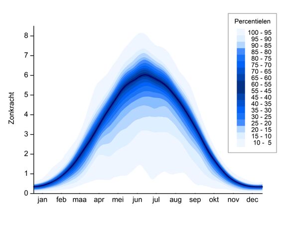 Gemiddelde zonkracht in Nederland per maand als het onbewolkt zou zijn. Het is goed te zien dat vanaf grofweg maart de zonkracht snel hoger wordt. Eind maart wordt vaak al zonkracht 3 bereikt. Pas vanaf oktober is de zonkracht weer lager dan 3 bij onbewolkt weer. Bron: RIVM.